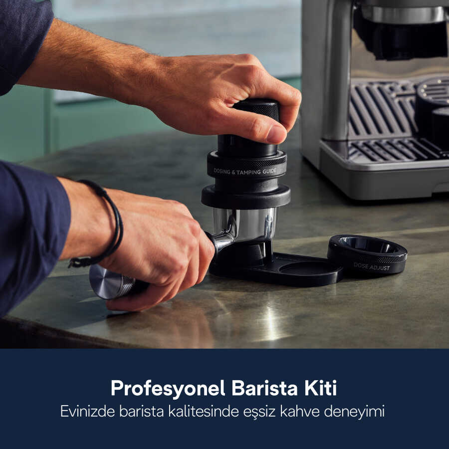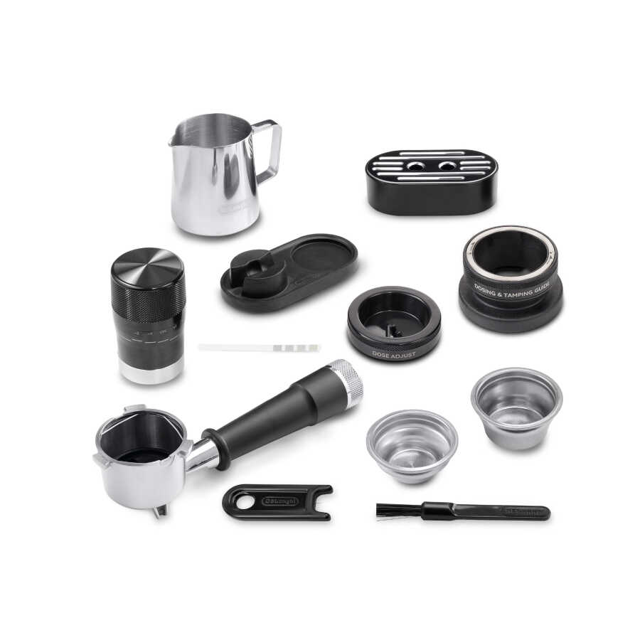 Kutuda: Dozajlama ve sıkıştırma kılavuzu olan bir sıkıştırma aparatı ve hassas sıkıştırma için sıkıştırma matı; mükemmel Latte'ler hazırlamak için süt sürahisi; kolay bakım için fırça ve buhar çubuğu temizleme aracı; optimum öğütme için doz ayarlama aracı; Espresso'nuzu kişiselleştirmek için iki tek duvarlı sepet (tek ve çift shot).