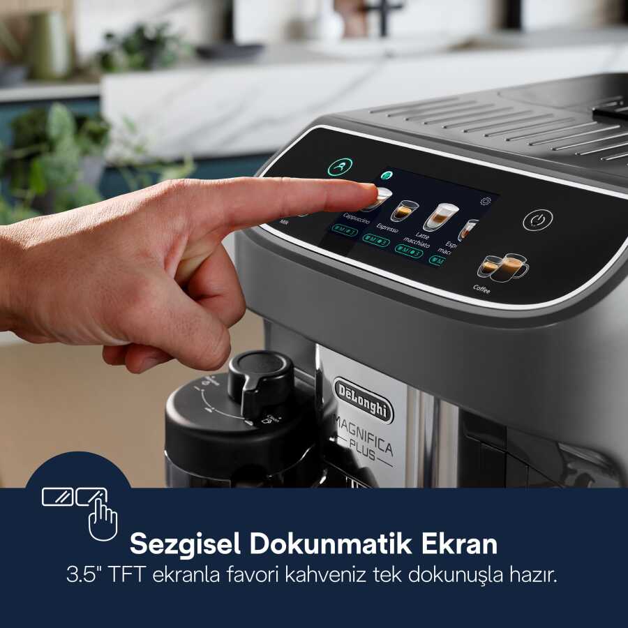 Gelince Haber VerMagnifica Plus, 3,5” TFT tam dokunmatik renkli ekranı ve sezgisel arayüzü ile kahve hazırlamayı kolay ve keyifli hale getirir. Ekran üzerinden içecekler arasında kaydırarak geçiş yapabilir, tarifleri damak zevkinize göre kişiselleştirebilirsiniz.
