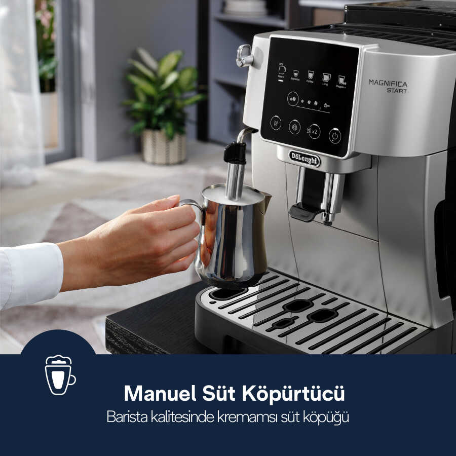 Evde en sevdiğiniz espresso bazlı içecekleri içmeye başlamak için ihtiyacınız olan her şeyi sağlayan De'Longhi Magnifica Start ile çekirdekten fincana kahve dünyasına girin. Kullanıcı dostu bir arayüze ve gümüş ve siyah kaplama gövdeye sahiptir ve tek bir dokunuşla sunulan özelleştirilmiş içecek seçeneklerine sahiptir.